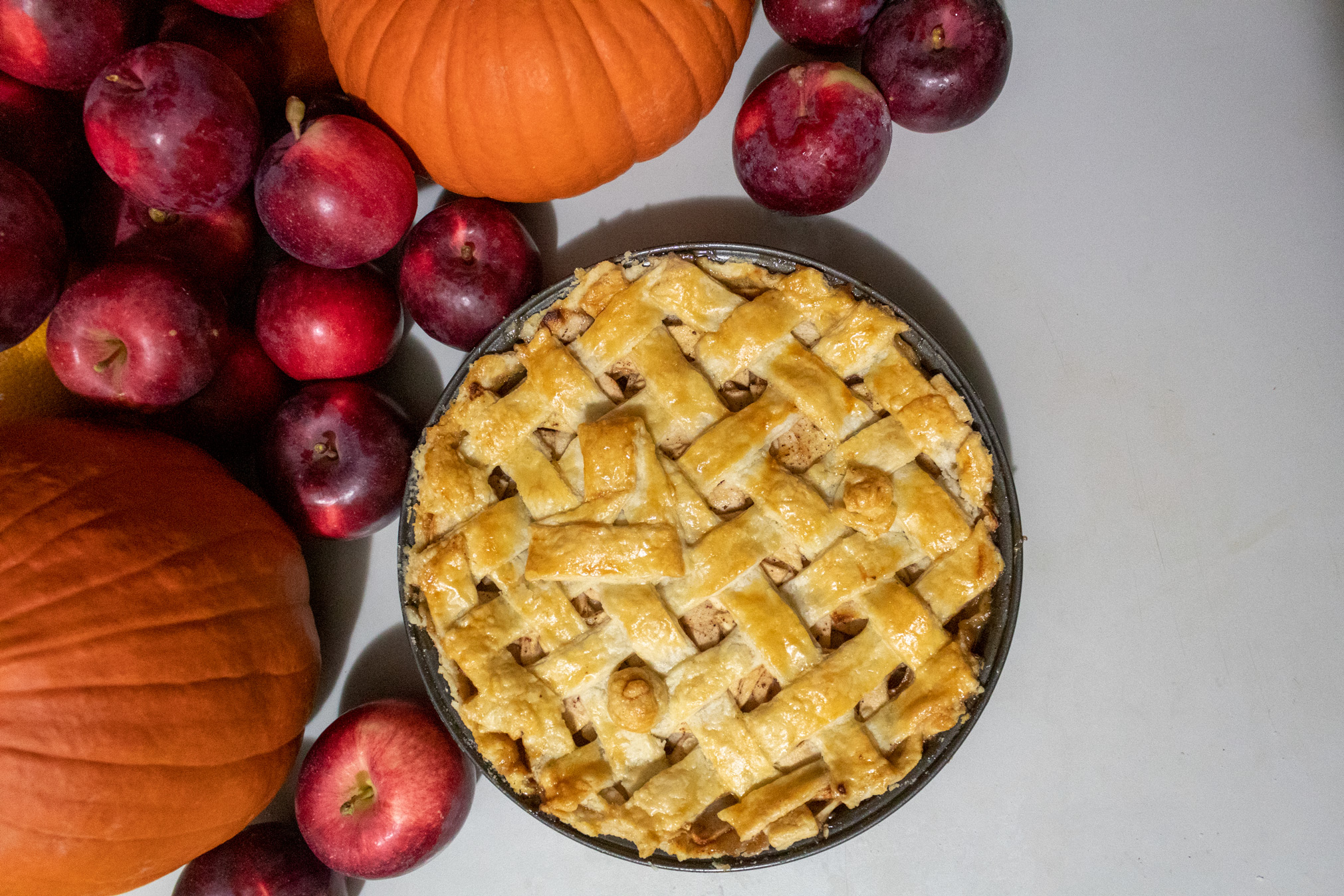 Descriptive text: Apple pie with latticed top crust viewed from above surrounded by Spartan apples and pumpkins on the top and left