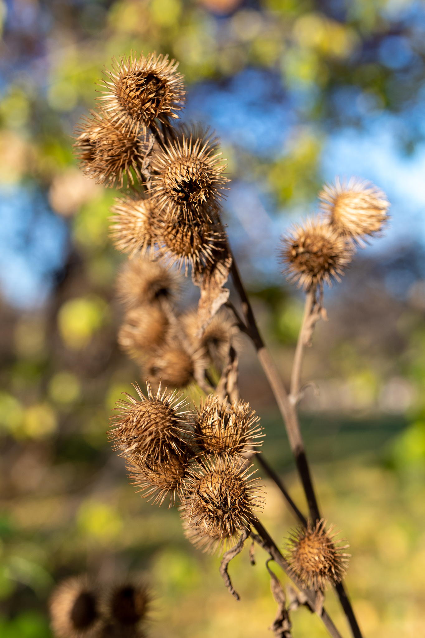 Round spiky seed carriers on vertical brown branches ready to cling to passersbyBack to Images Previous Next