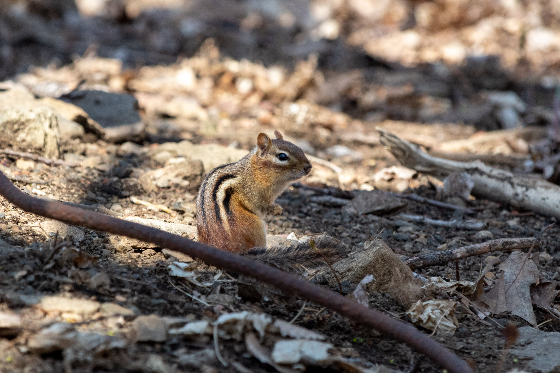 Descriptive text: Chipmunk crouching on the forest floor