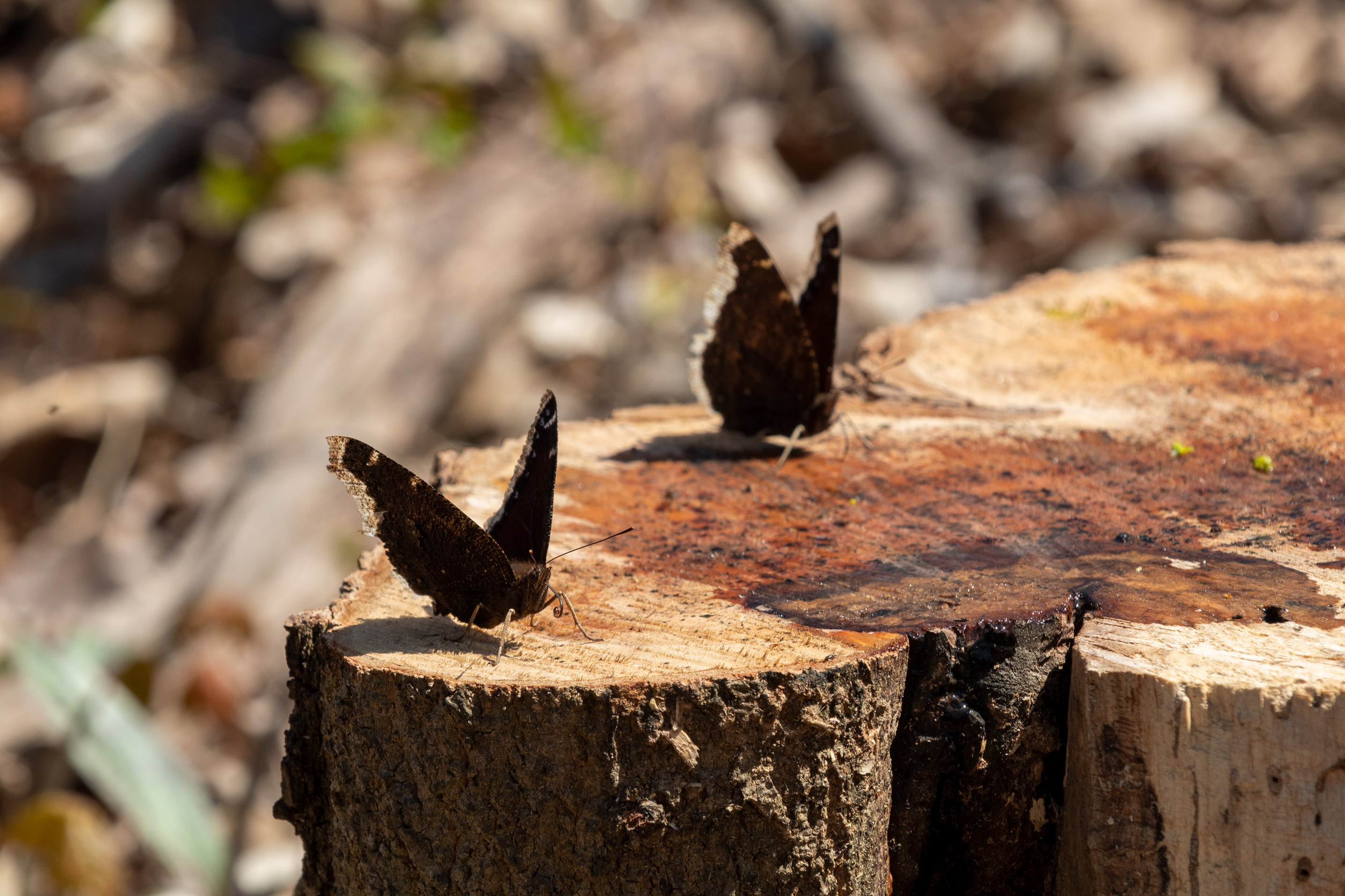 Descriptive text: Two butterflies with brown, blue, and white wings sipping sap from a tree stump