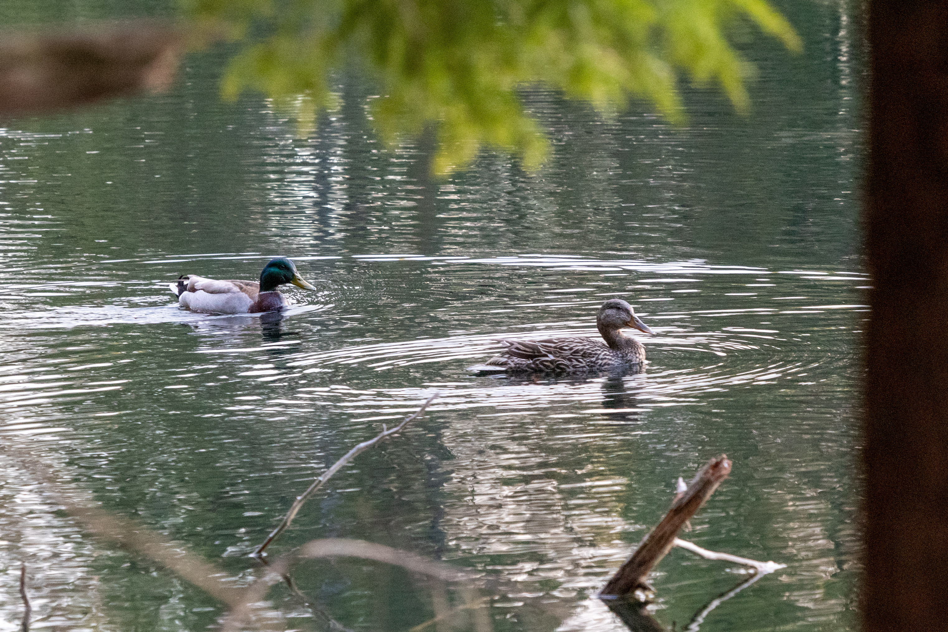 Descriptive text: Two mallard ducks floating on a slightly rippled lake, viewed between tree branches