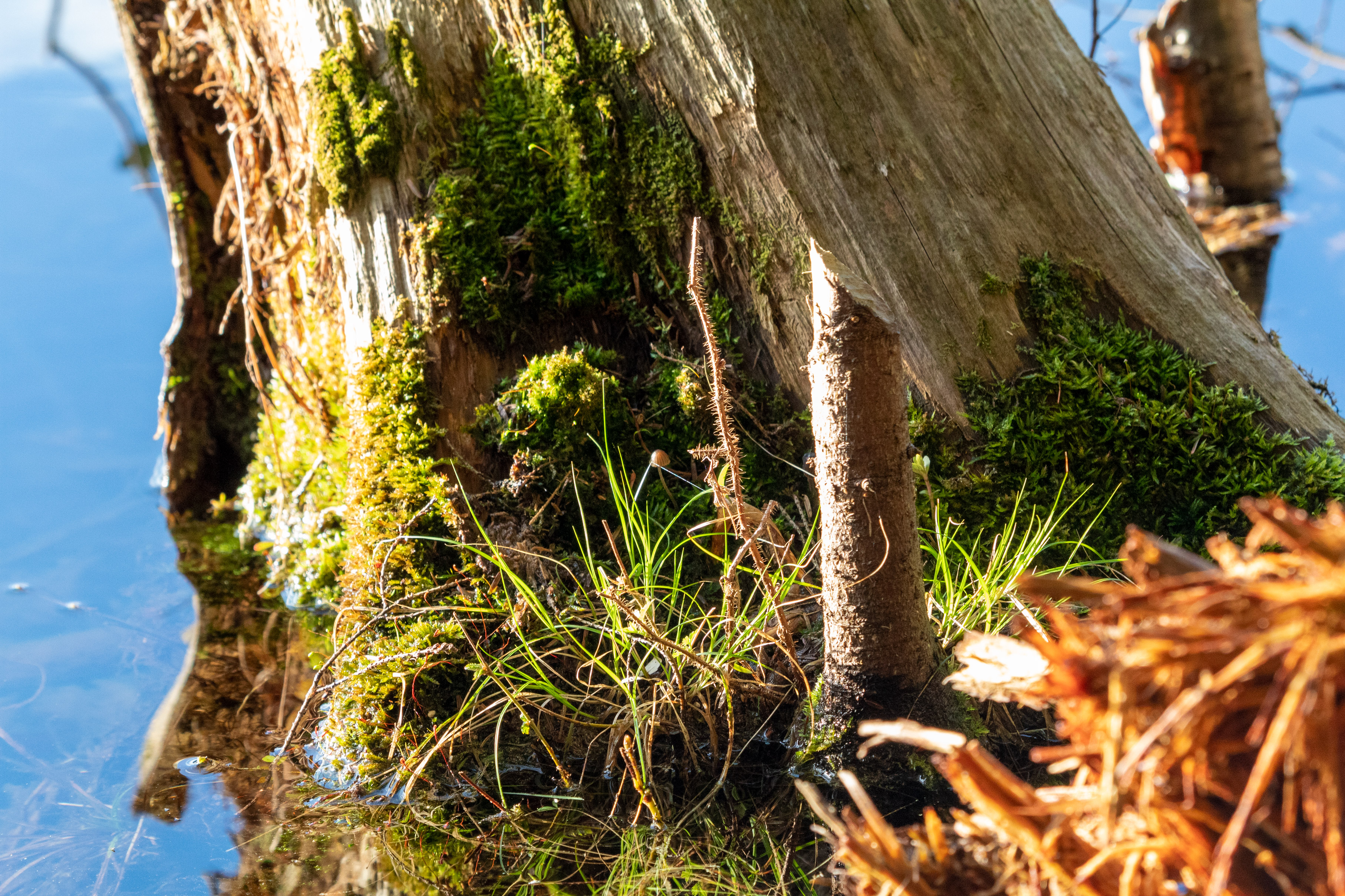 Descriptive text: Tiny mushroom hidden in a tuft of grass on a tree log surrounded by water