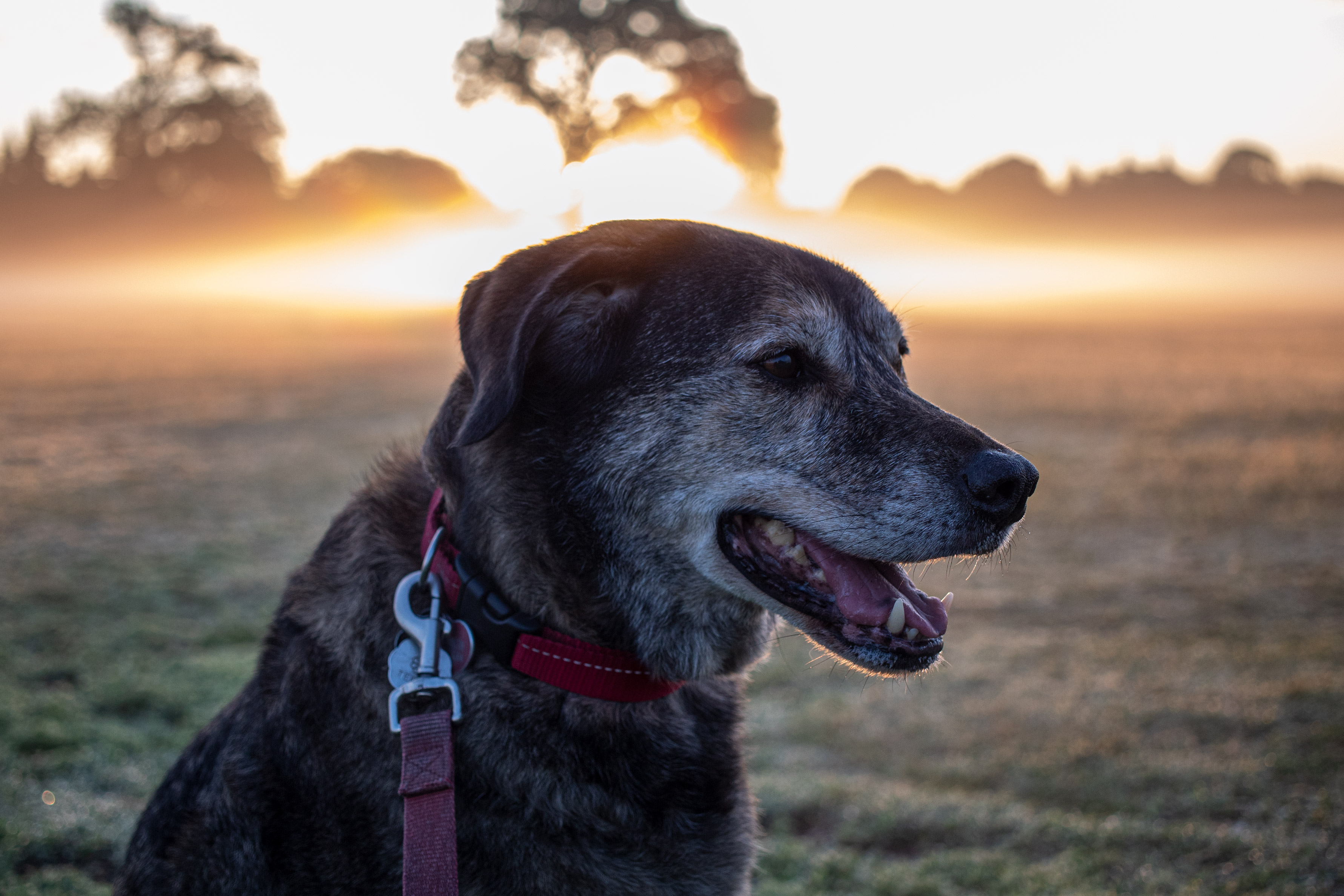 Descriptive text: Dog with a red leash and collar in front of a yellow foggy sunrise