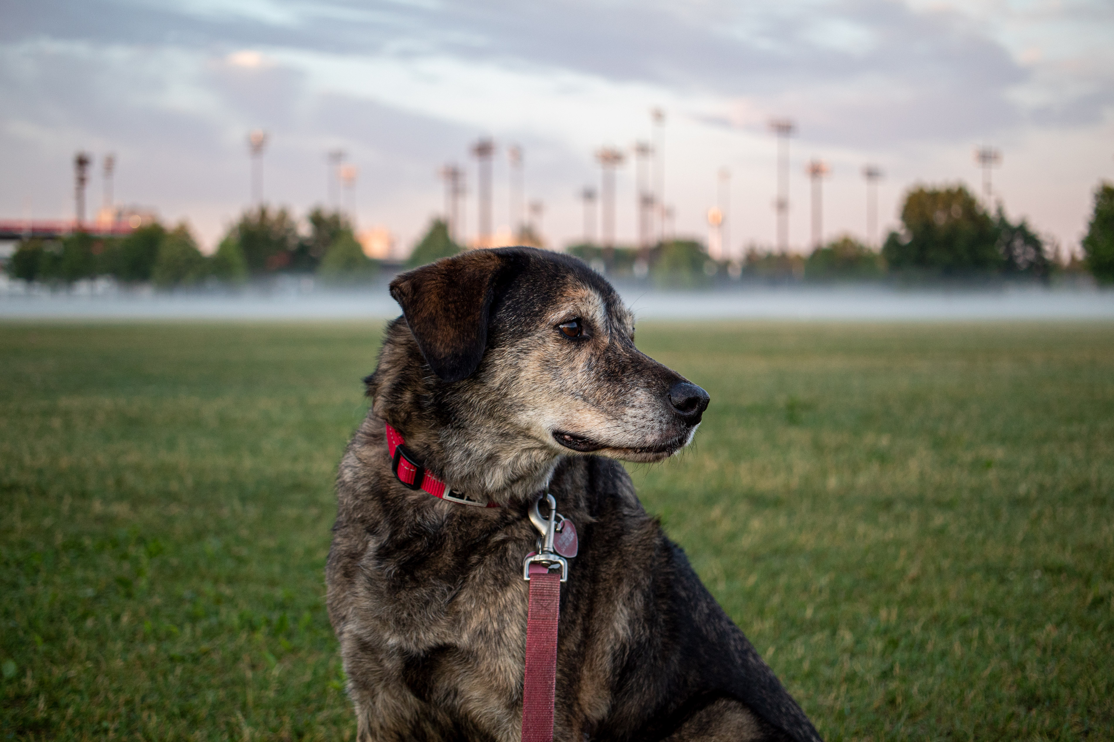 Descriptive text: Dog with a red leash and collar in front of a fog-covered field