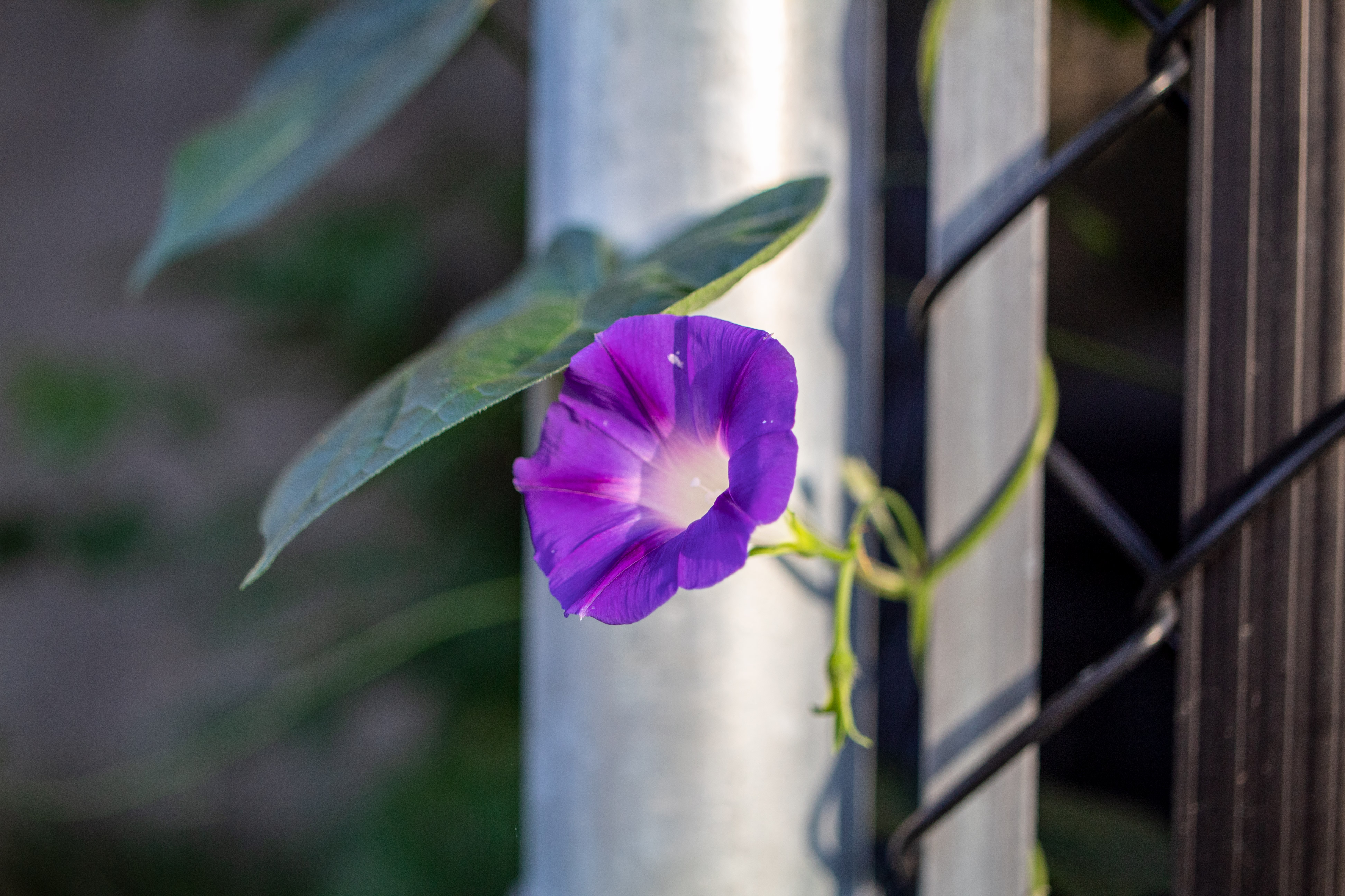 Descriptive text: Purple flower with white centre growing of a fence with a single large heart-shaped leaf