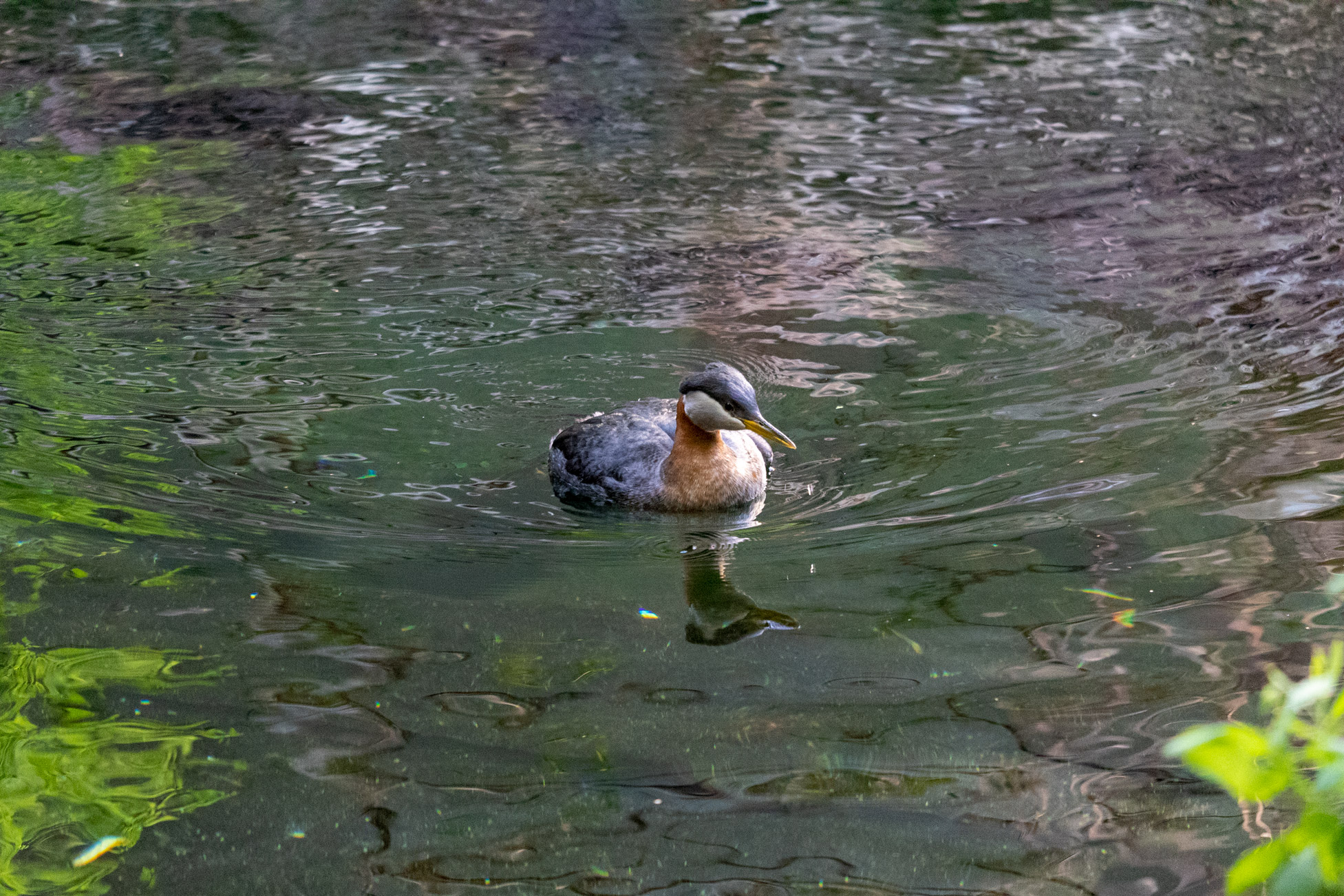 Descriptive text: Black, orange, and white bird floating on the water