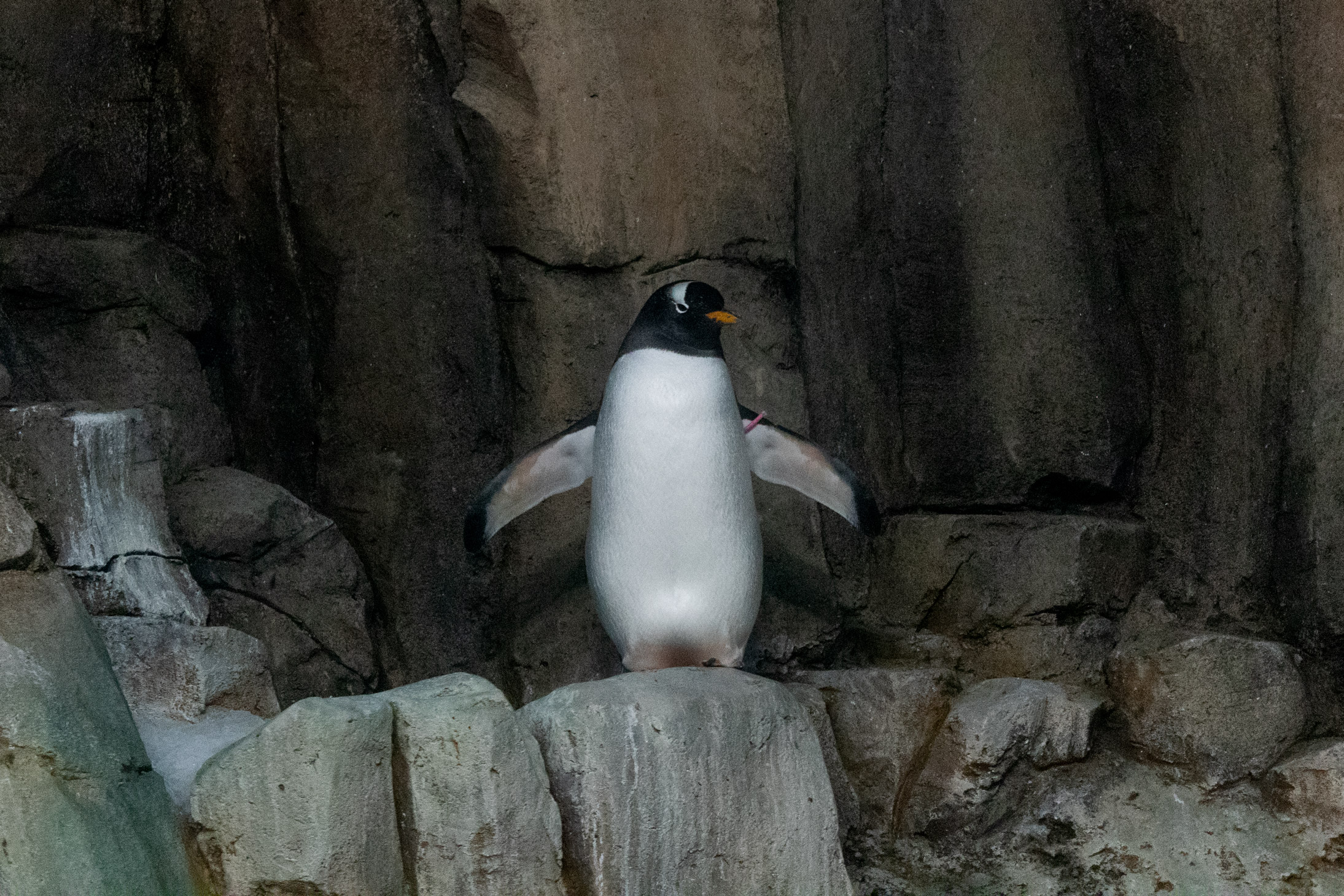 Descriptive text: Penguin standing on a rock with arms outstretched