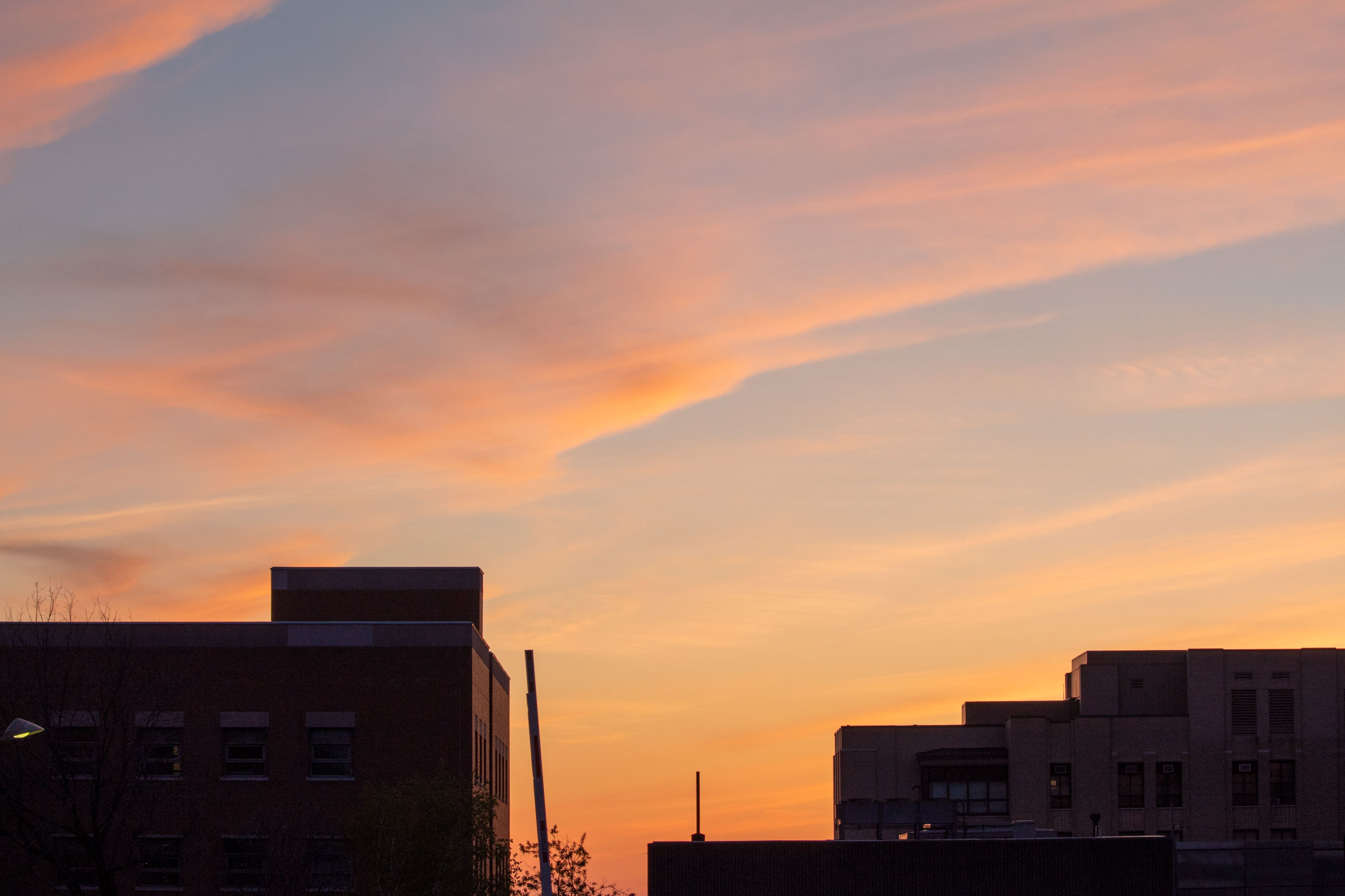 Descriptive text: Outline of buildings against orange-pink clouds stretching across a blue sky that fades to orange