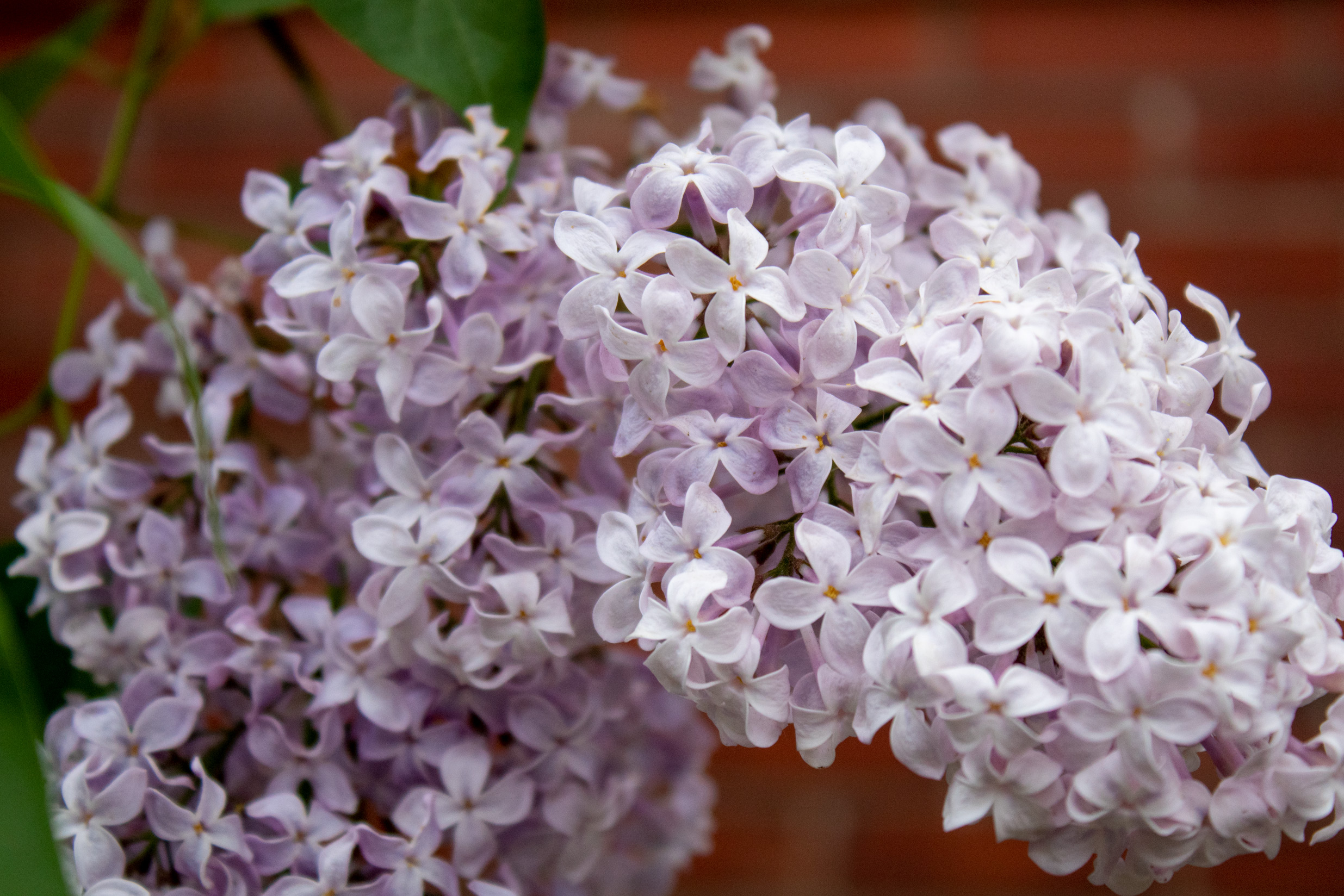 Descriptive text: Clump of pale pink flowers on a blurred brick background