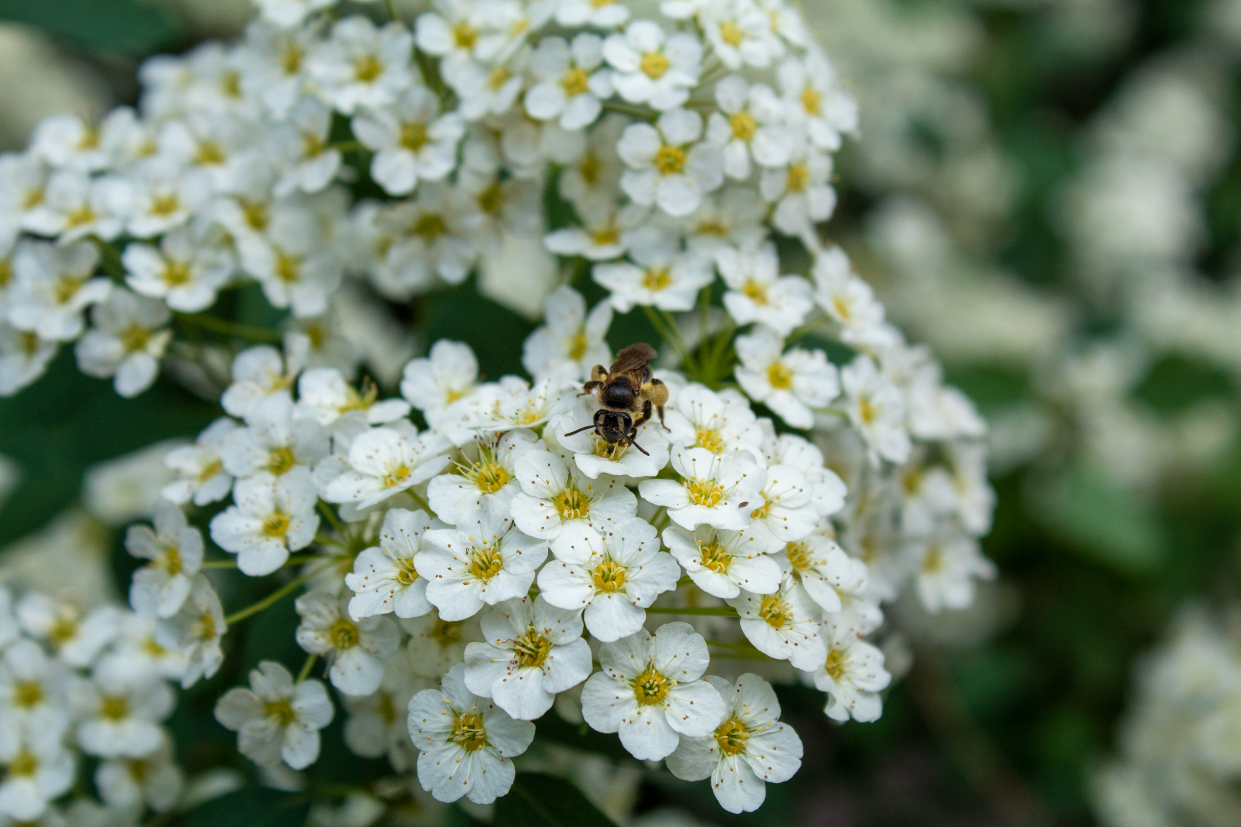 Descriptive text: Bee sitting on a bundle of white flowers