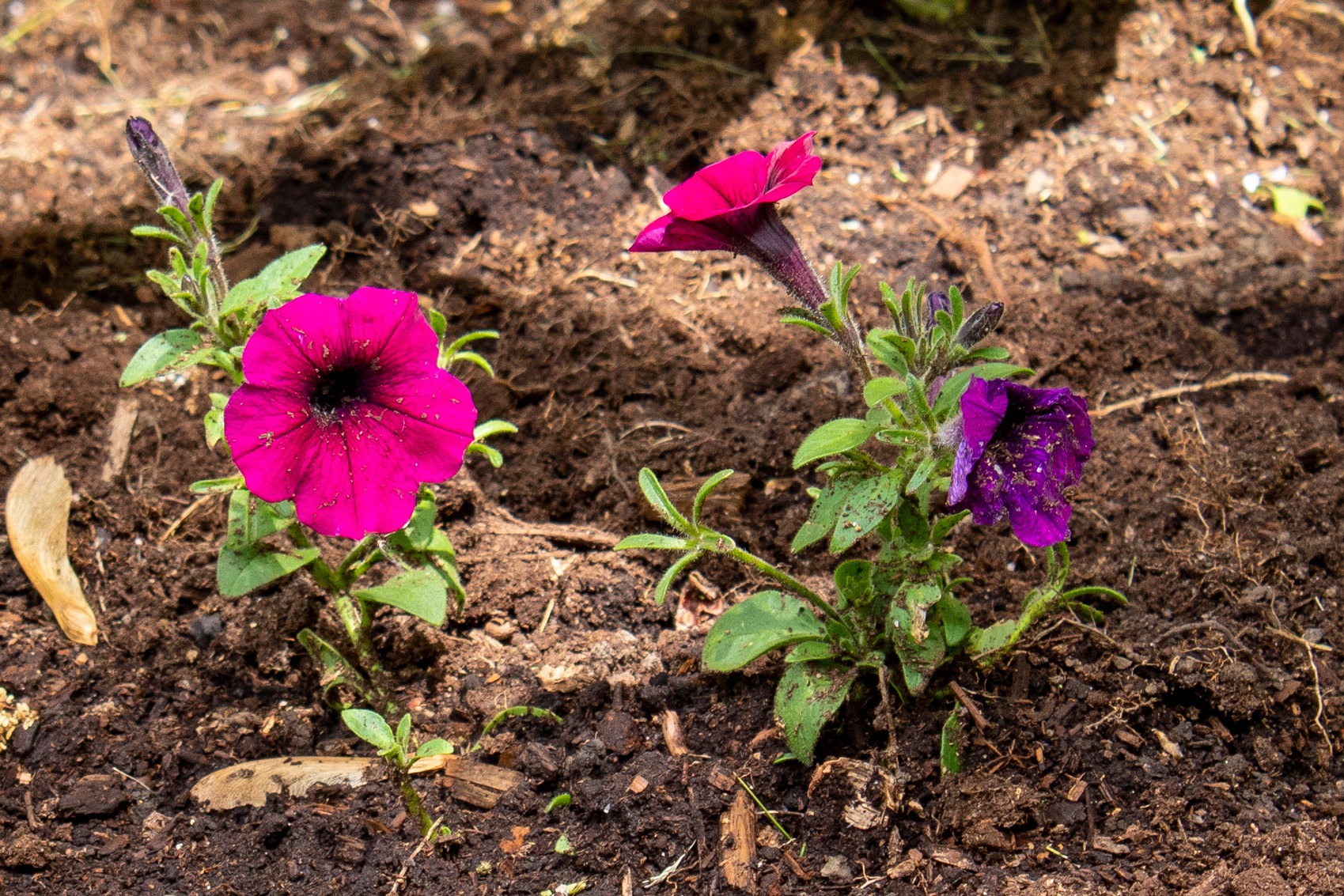 Descriptive text: Two flowers, one a pinkish purple and the other a deeper, bluer, purple