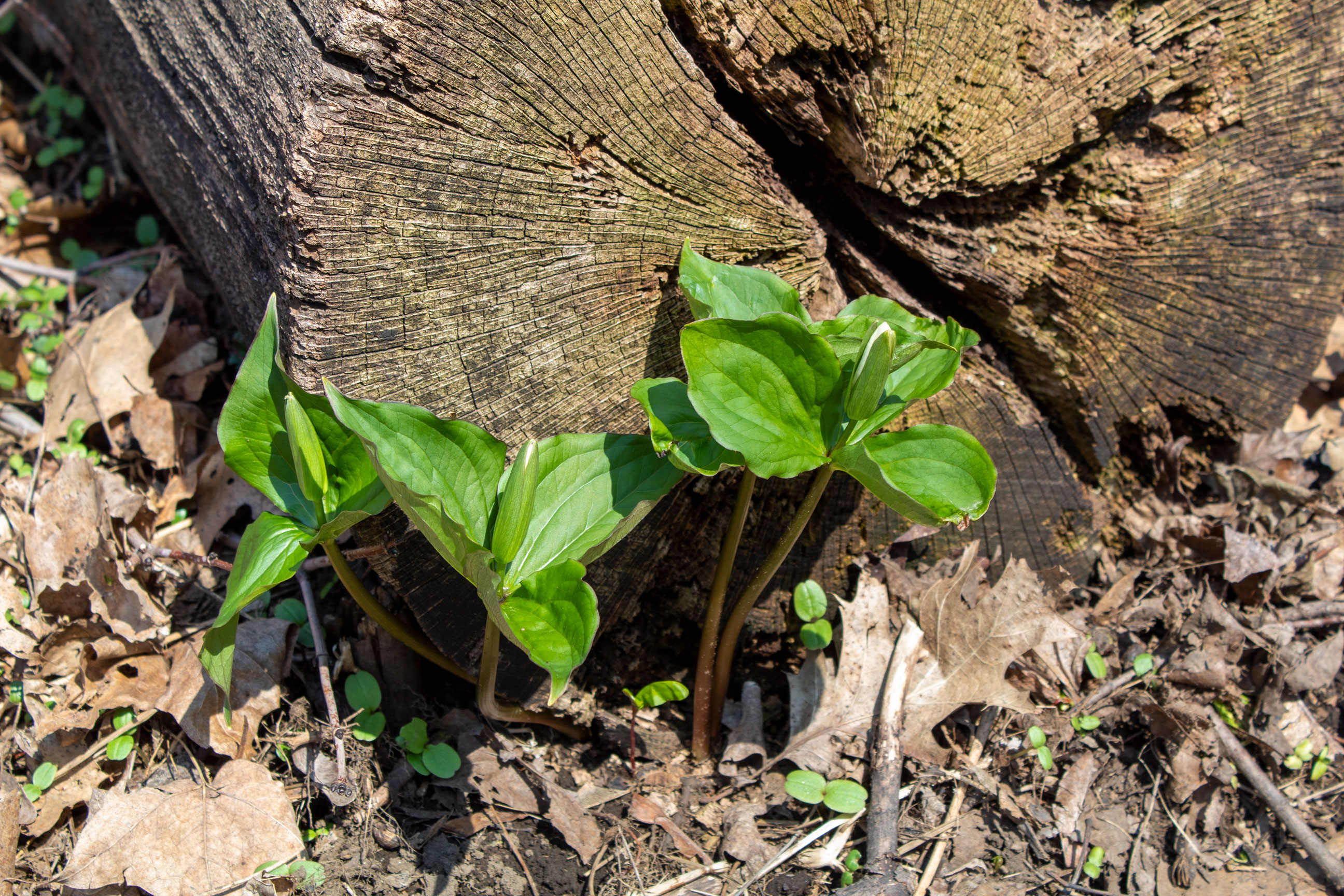 Descriptive text: Trilliums beside a log on the forest floor