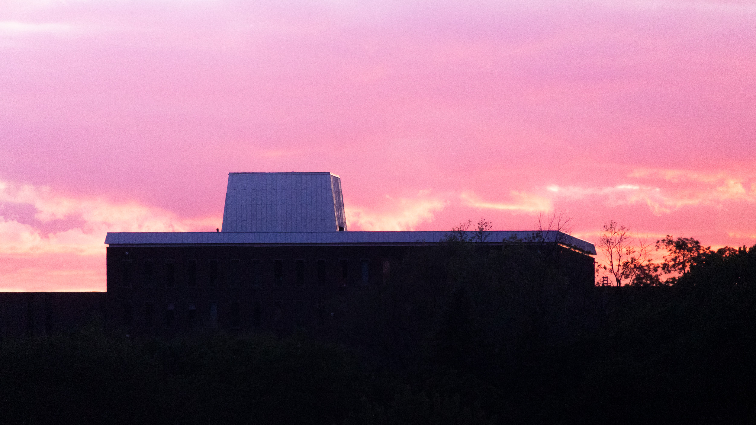Descriptive text: A building backlit with the pink glow of a sunset sky