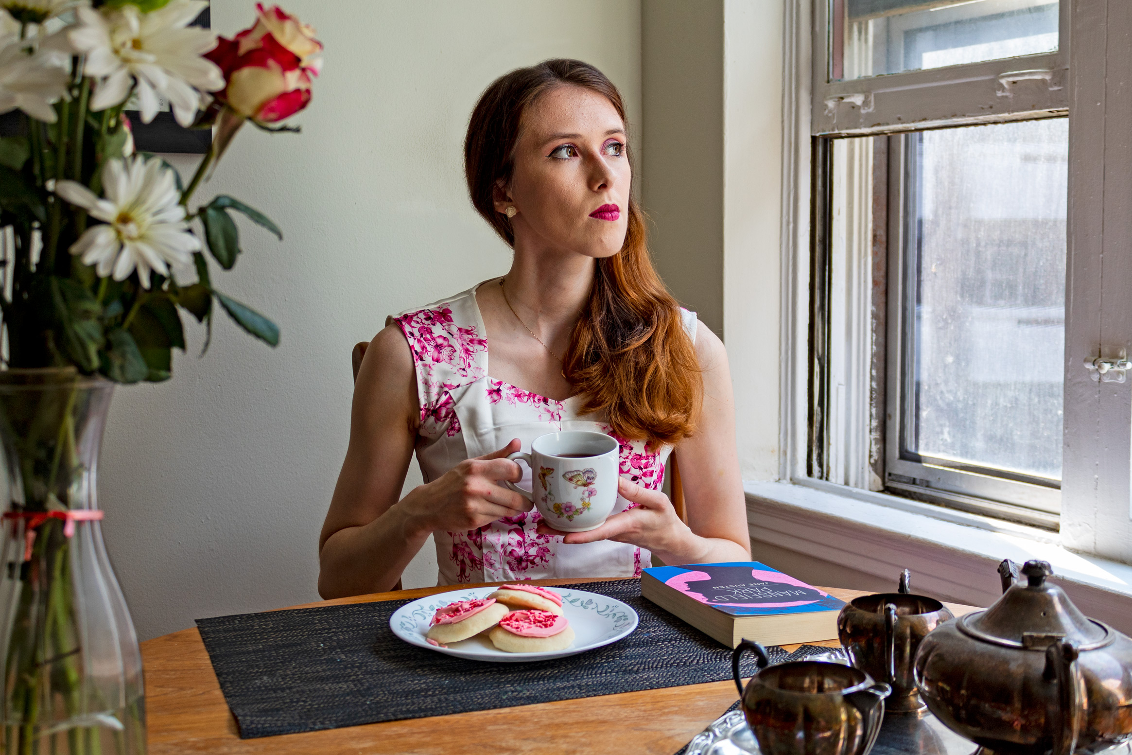 Descriptive text: Woman holding a tea cup and gazing out of a window; in front of her are cookies and a book